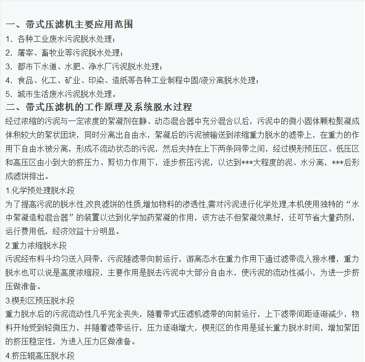帶式壓濾機帶式壓榨過濾機脫水過程可分為預處理、重力脫水、楔形區預壓脫水及壓榨脫水四個重要階段技運用全新型設備過濾機程控自動廂式壓濾機、隔膜壓濾機、深度污泥脫水壓濾機、一體化污水污泥處理設備、在線精密過濾系統等價格合理、性能可靠的環保過濾產品。